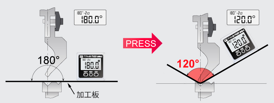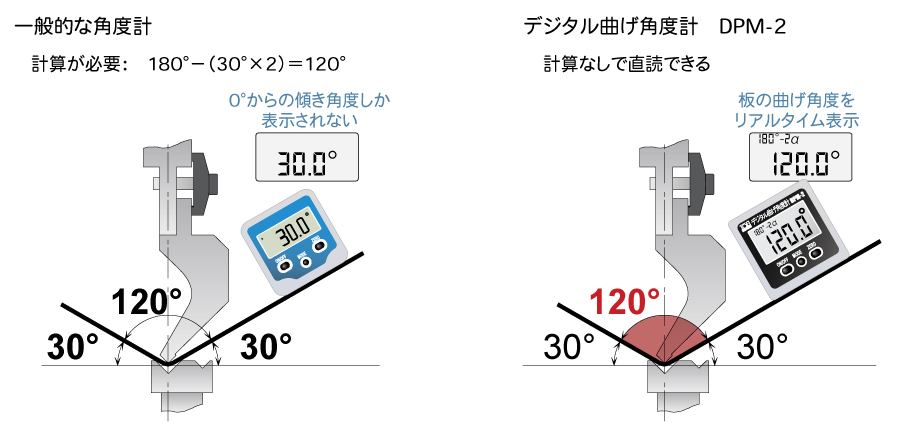 在普通角度计的情况下,即使尝试测量钣金的弯曲角度,也只会显示从0度开始的倾斜角度(作为参考),因此需要进行计算才能获得弯曲角度。